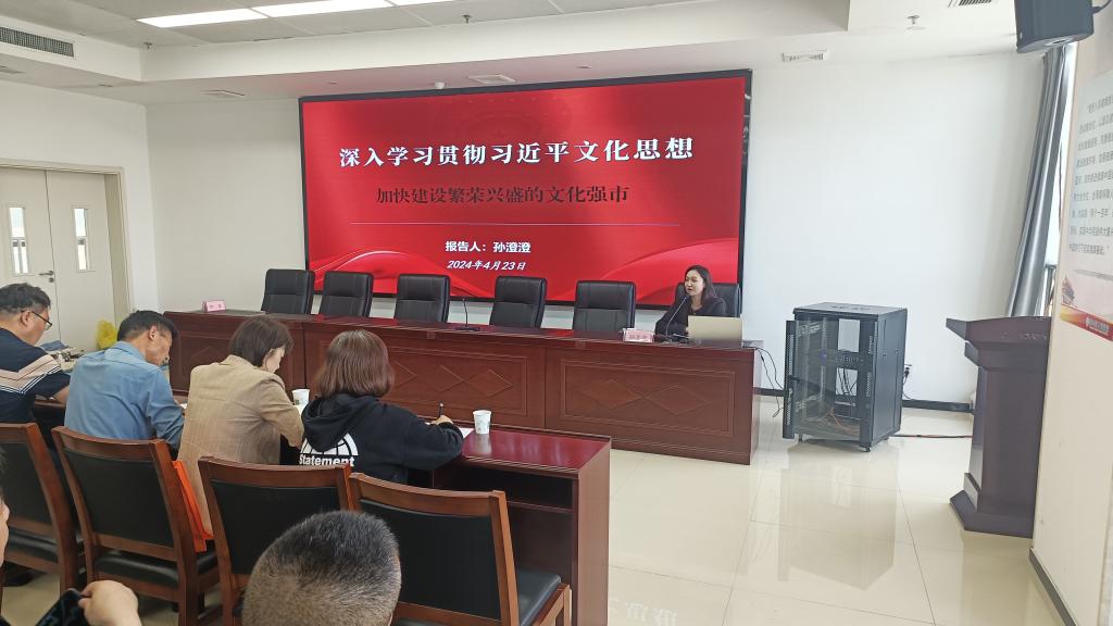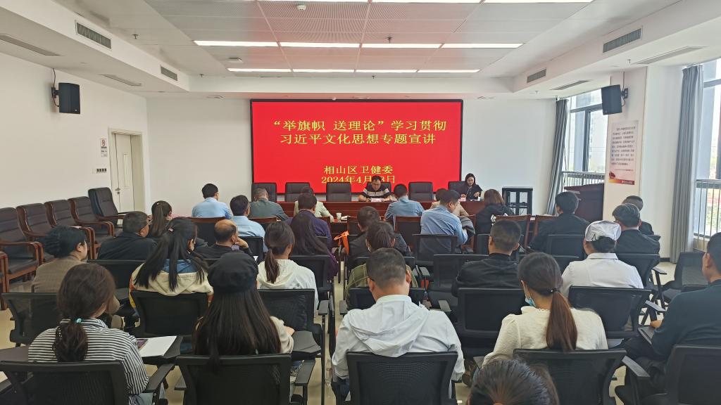 4月23日下午,淮北市相山区卫生健康系统“举旗帜·送理论”学习贯彻习近平文化思想宣讲报告会在相山区人民医院召开。伟德国际1949官网孙澄澄作为淮北市委宣讲团成员,受邀作题为《深入学习贯彻习近平文化思想·加快建设繁荣兴盛的文化强市》的宣讲报告。相山区卫生健康委班子成员全体参会,相山区卫生健康委党委书记柳泰主持会议。