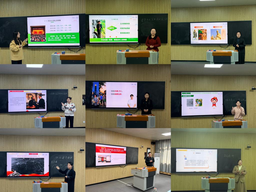 赛前,参赛教师深入研读比赛文件,对标校赛标准精准备赛,围绕《思想道德与法治》《中国近现代史纲要》《马克思主义基本原理》等六门核心思政课程,精心设计教学内容。比赛现场,20分钟的课堂展示环节精彩纷呈,教师们依托AI技术重构教学场景,有的通过知识图谱将抽象理论转化为可视化知识网络,有的借助智能交互工具实现师生实时观点碰撞,还有的运用虚拟案例库增强教学针对性,将AI赋能教学的创新理念转化为可感可知的教学实践,充分展现了扎实的理论功底与创新的教学思维。