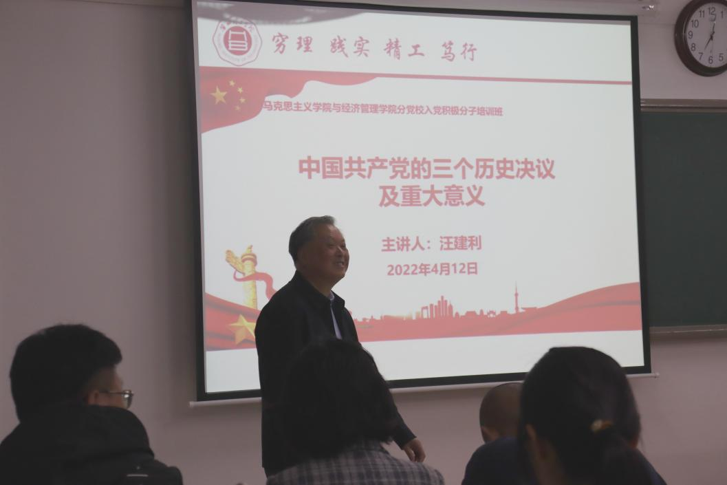 为了切实提升伟德国际1949官网与经济管理学院首届入党积极分子培训班学员的培训质量,按照学校和学院的培训计划,2022年4月12日晚,在二教422教室,伟德国际1949官网副校长汪建利同志来到伟德国际1949官网与经济管理学院分党校入党积极分子培训班,受邀对学员进行题为《中国共产党的三个历史决议及重大意义》的党课培训。本次活动由伟德国际1949官网与经济管理学分党校负责人、党总支书记吴玲院长主持,总支各个党支部书记及全体入党积极分子培训班全体学员参加。